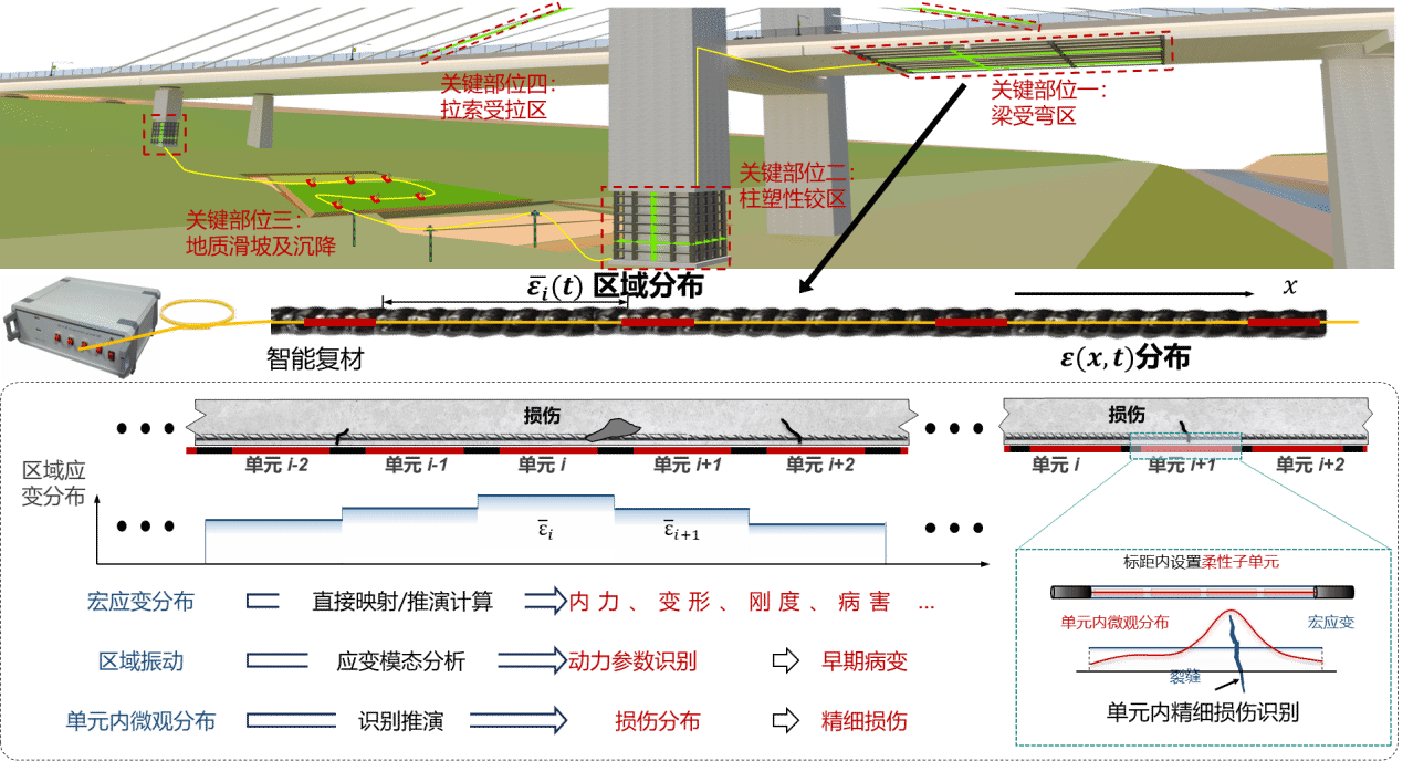 针对传统结构监测效率低、内部早期损伤难发现等问题,采用光纤与碳纤传感元件嵌入复合基体的方法,研制出兼具承载与感知功能的玄武岩纤维智能复合材料、解调仪及配套智能监测技术体系。成果可应用于桥梁工程、隧道工程、轨道交通等。